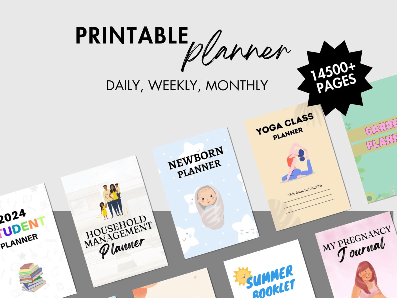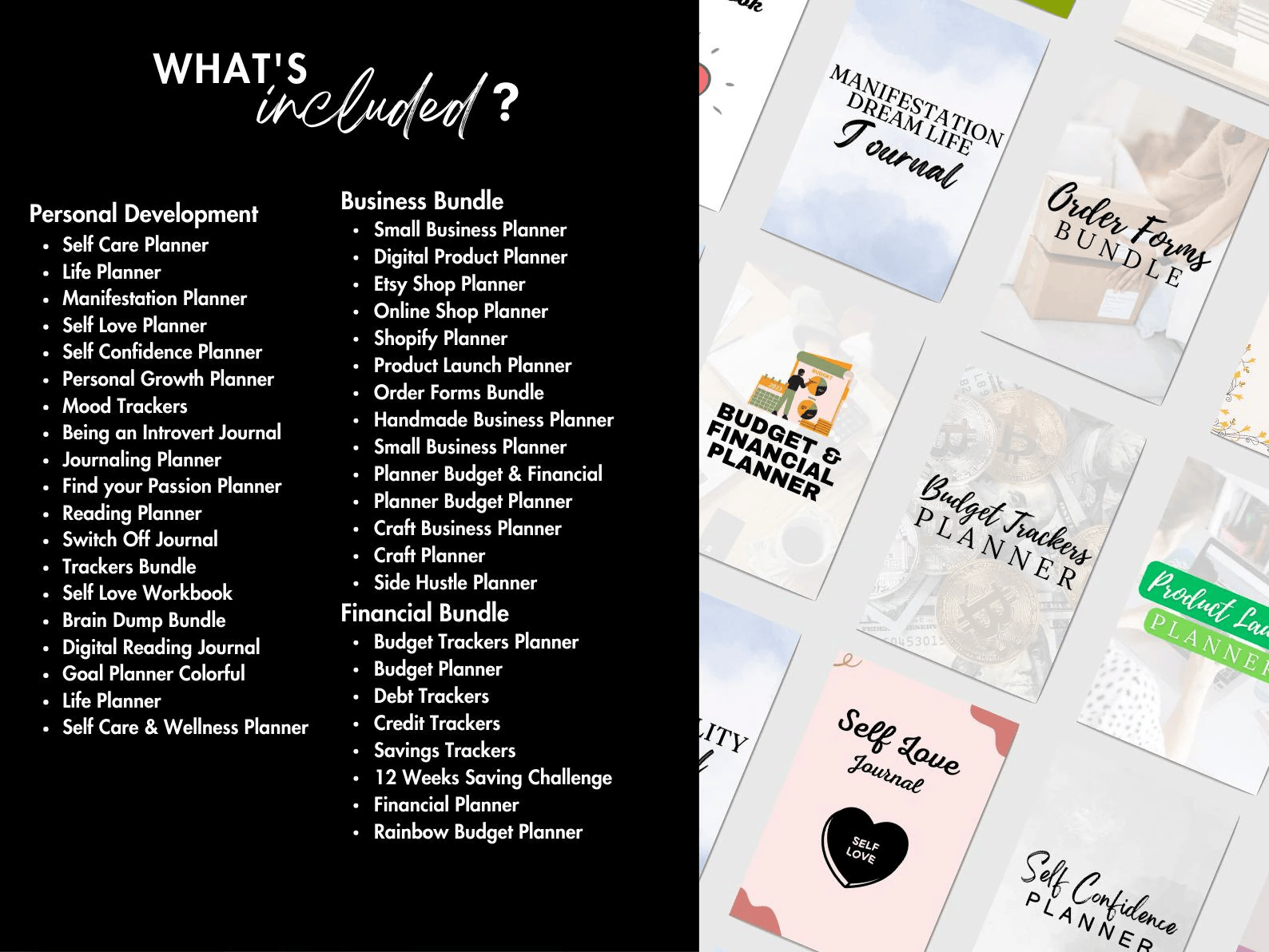 💼 Business & Finance: Small business planners, Shopify organizers, Budget trackers, Debt payoff challenges, and Order forms.